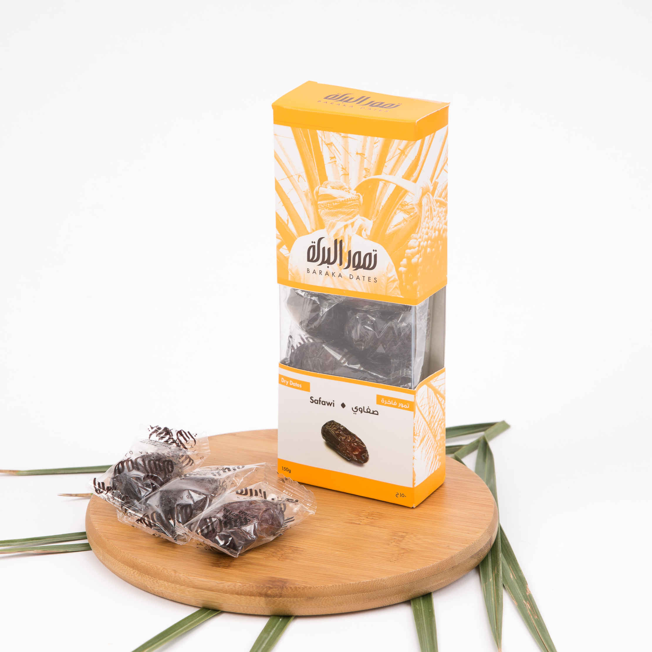 “Safawi dates are distinguished by their intense black color, medium size, and smooth texture. Their taste is similar to that of Ajwa dates. Safawi dates are grown in Medina. Single wrapped Packed in a box.