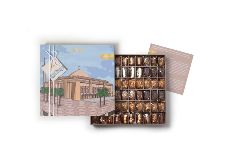علبة المسجد الحرام، من مجموعة رمضان 2025 إصدار محدود. تم رسمها يدويًا بالتعاون مع رسام محلي. تحتوي على 1.220 كيلو جرام من التمر المحشو وبطاقة تعريفية للمسجد الحرام التاريخي.