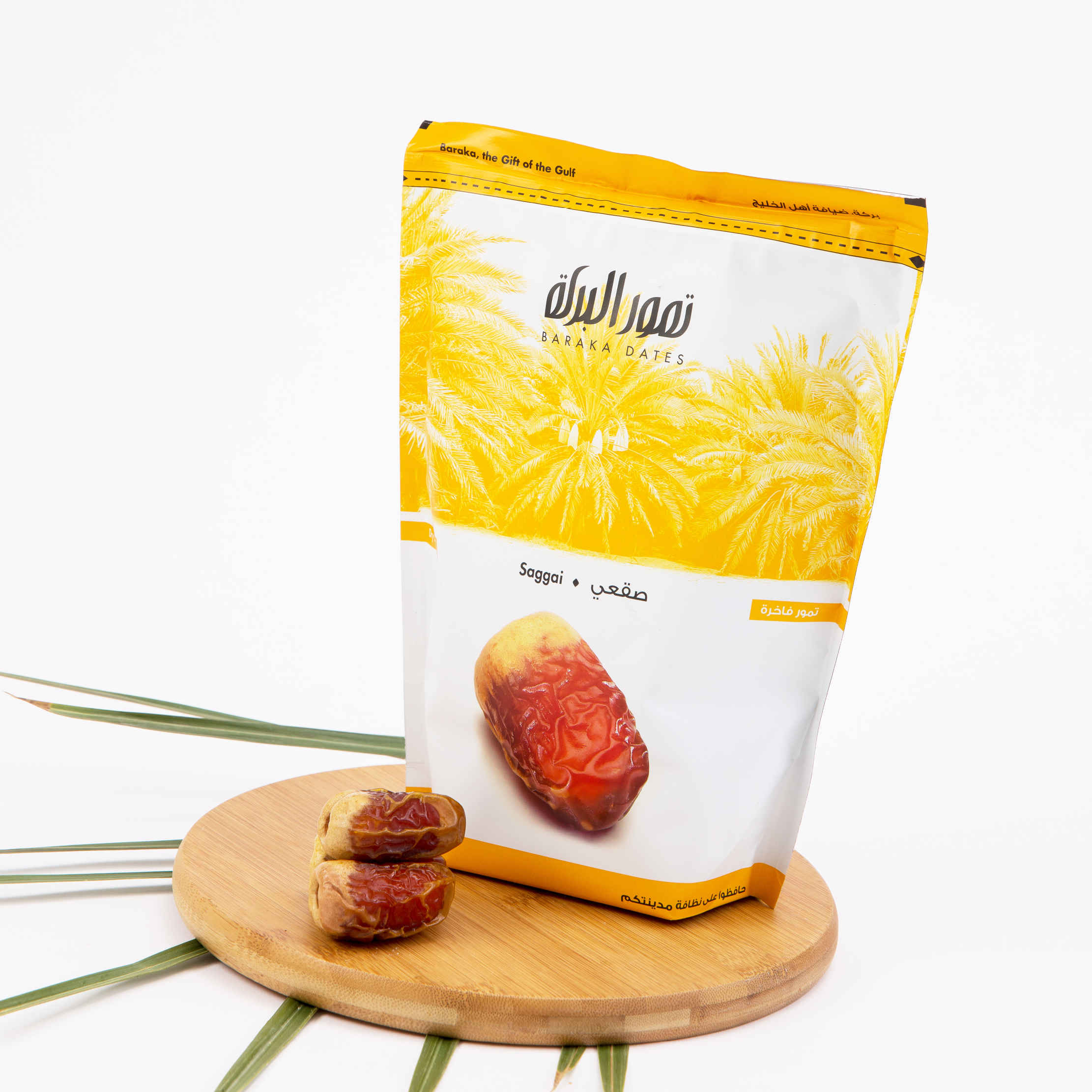 “تمور الصقعي تتميز بلونها المصفر من الأعلى وملمسها الجاف، بينما تكون باقي الثمرة لونها بنيًا وملمسها طريًا، مع مذاق معتدل الحلاوة. معبأ في كيس قابل لإعادة الإغلاق