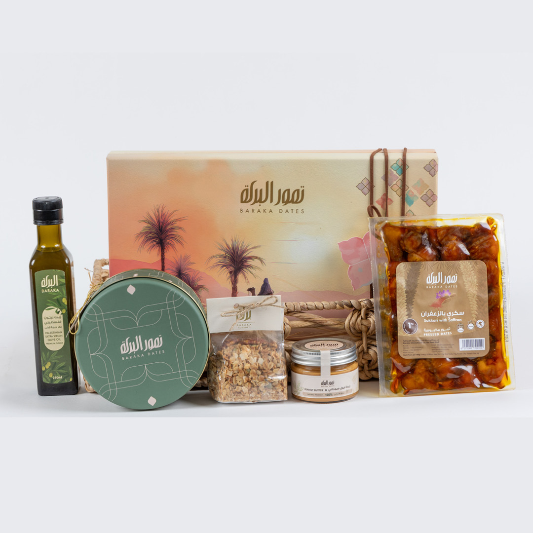 سلة البامبو , تحتوي على أصناف منوعة من تمور البركة. مناسبة كهدية خاصة.