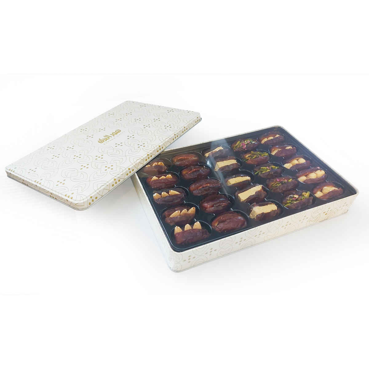 علبة هدايا تضيف لمسة جمالية لكل مناسبة هذه العلبة تحتوي على مزيج من تمر خضري محشي بالنكهات مختلفه. معبأ في علبة معدنية فاخره