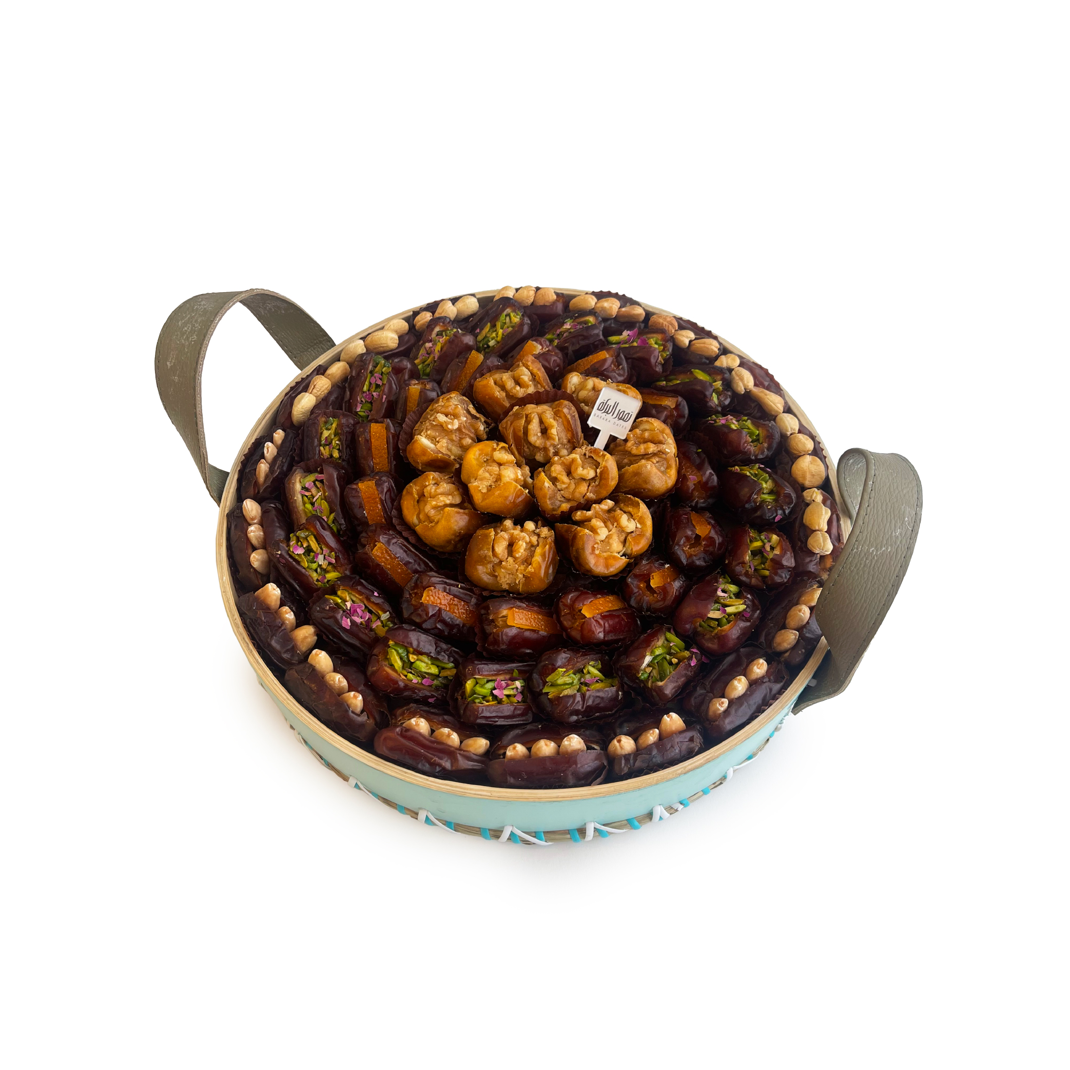 هذه الصينية مليئة بتنوع النكهات، حيث تتضمن تمر خضري محشو بالبيكان المكرمل والبرتقال، وتمر خضري محشو باللوز، مع لمسة من الرنجيننه المحلاة بالعسل. وتزين بالقرفة والكراميل والفستق، إضافة إلى الخبيصة التقليدية لإكمال تجربة النكهات الغنية والشهية.مما يجعلها خيار مناسب للضيافه
