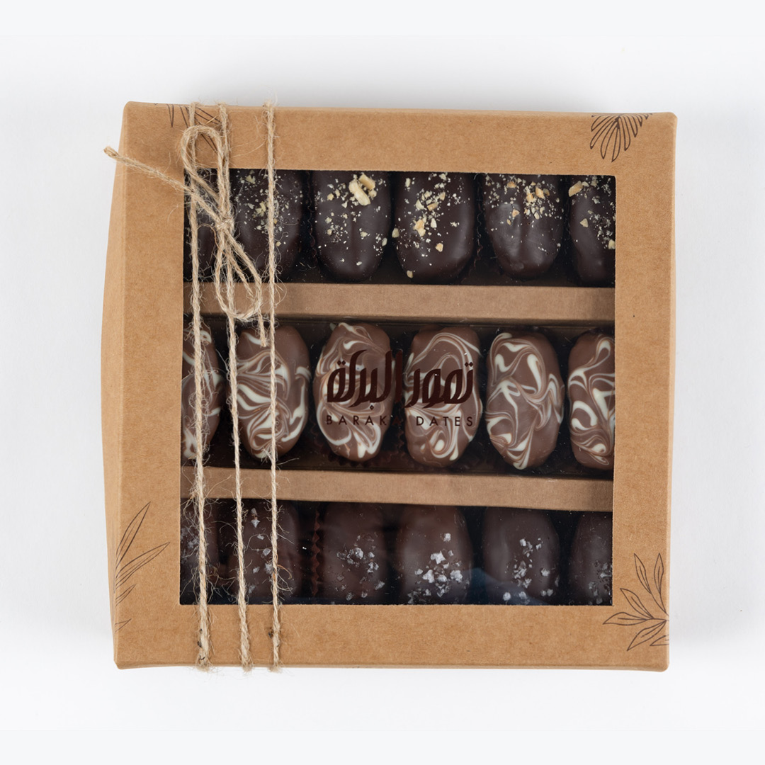 علبه تحتوي على ٣ أصناف مميزة من نكهات المجدول : مدجول بوينو بايتس ،مدجول سولتيد كراميل و مدجول بالكاكاو الداكن و زبدة الفول السوداني